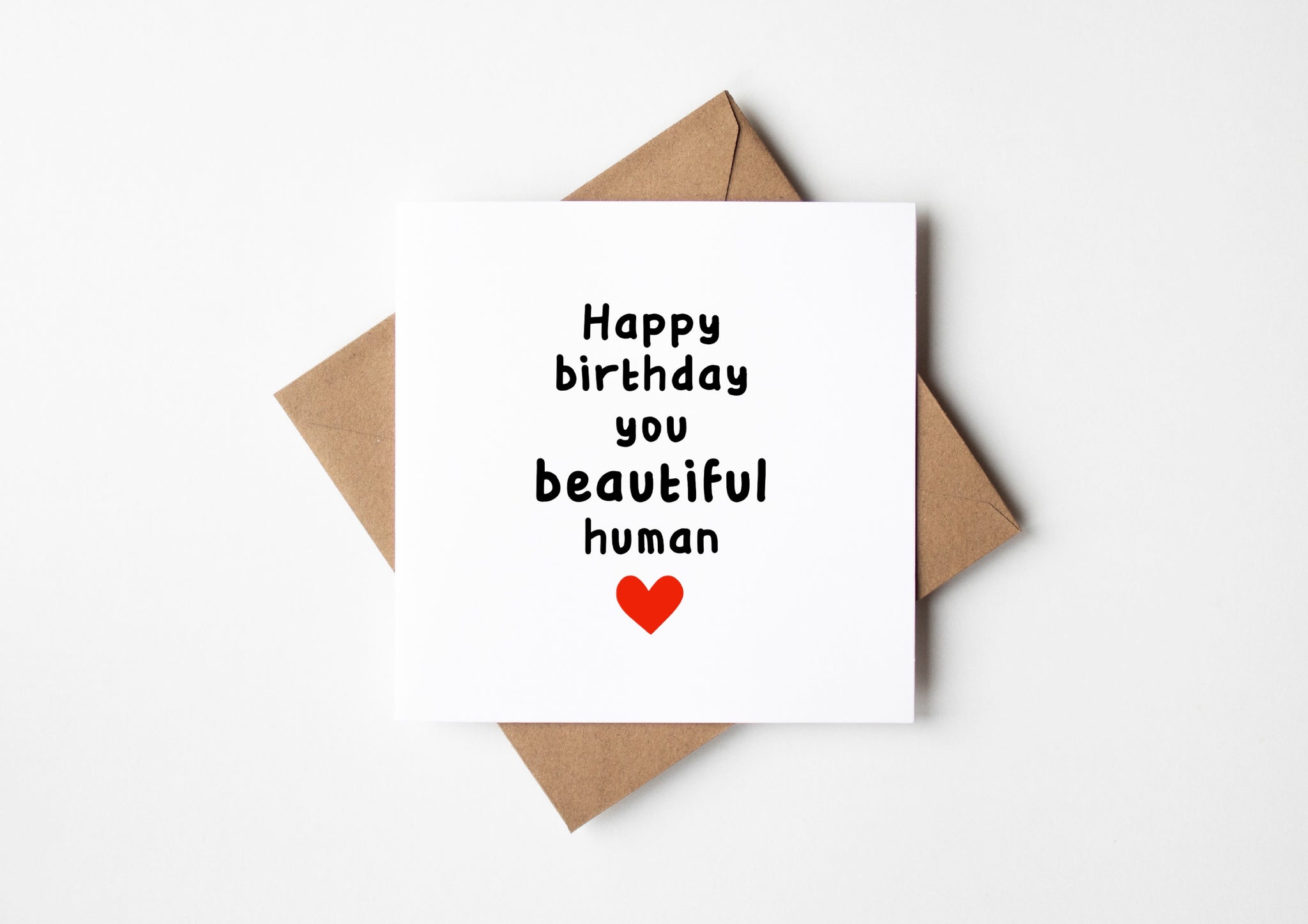 Featuring handwritten-style typography that reads "Happy Birthday You Beautiful Human" and finished with a hand drawn red heart, it’s the perfect way to make someone feel truly special.