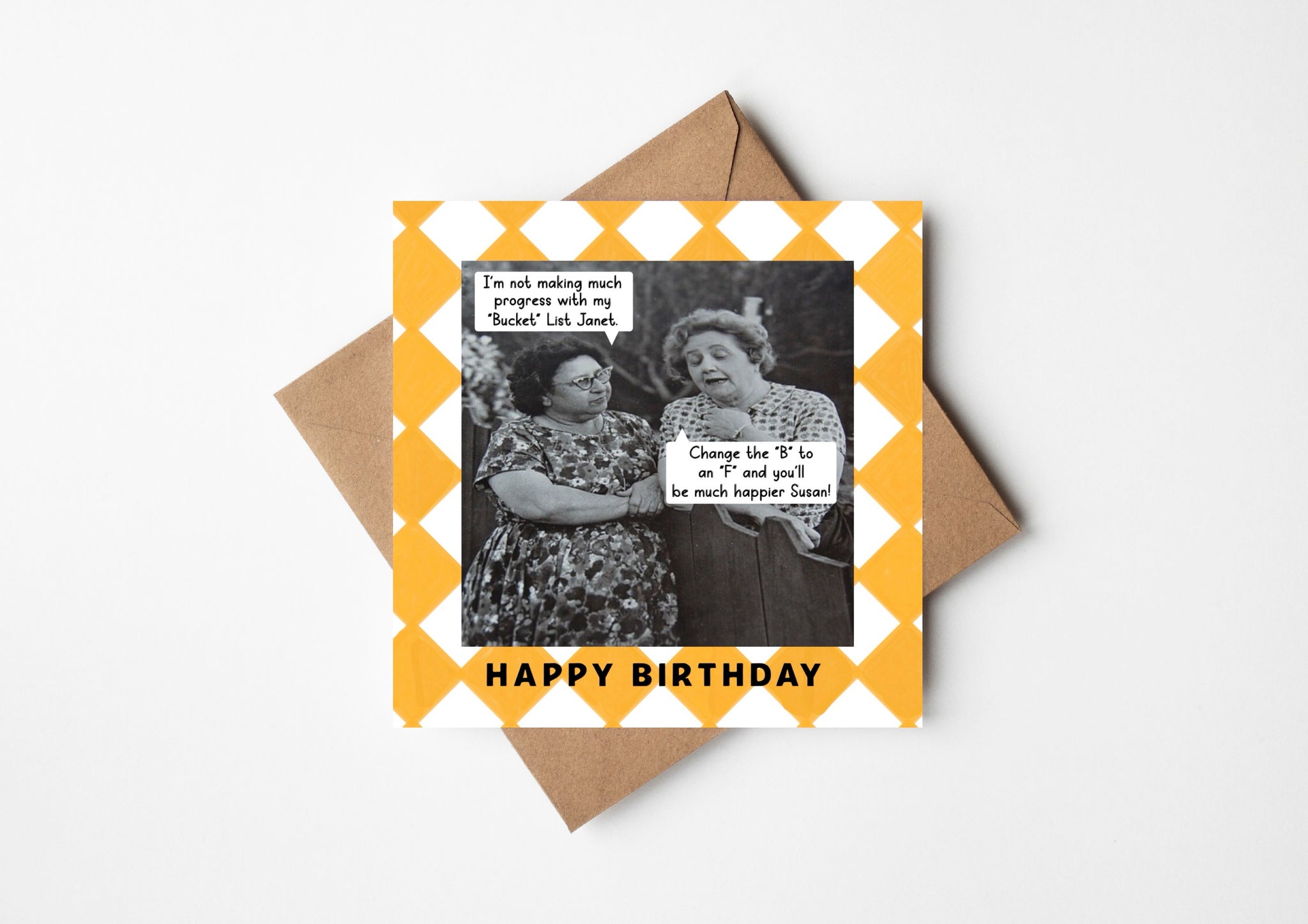 This playful birthday card features a vintage black and white graphic and retro typography.