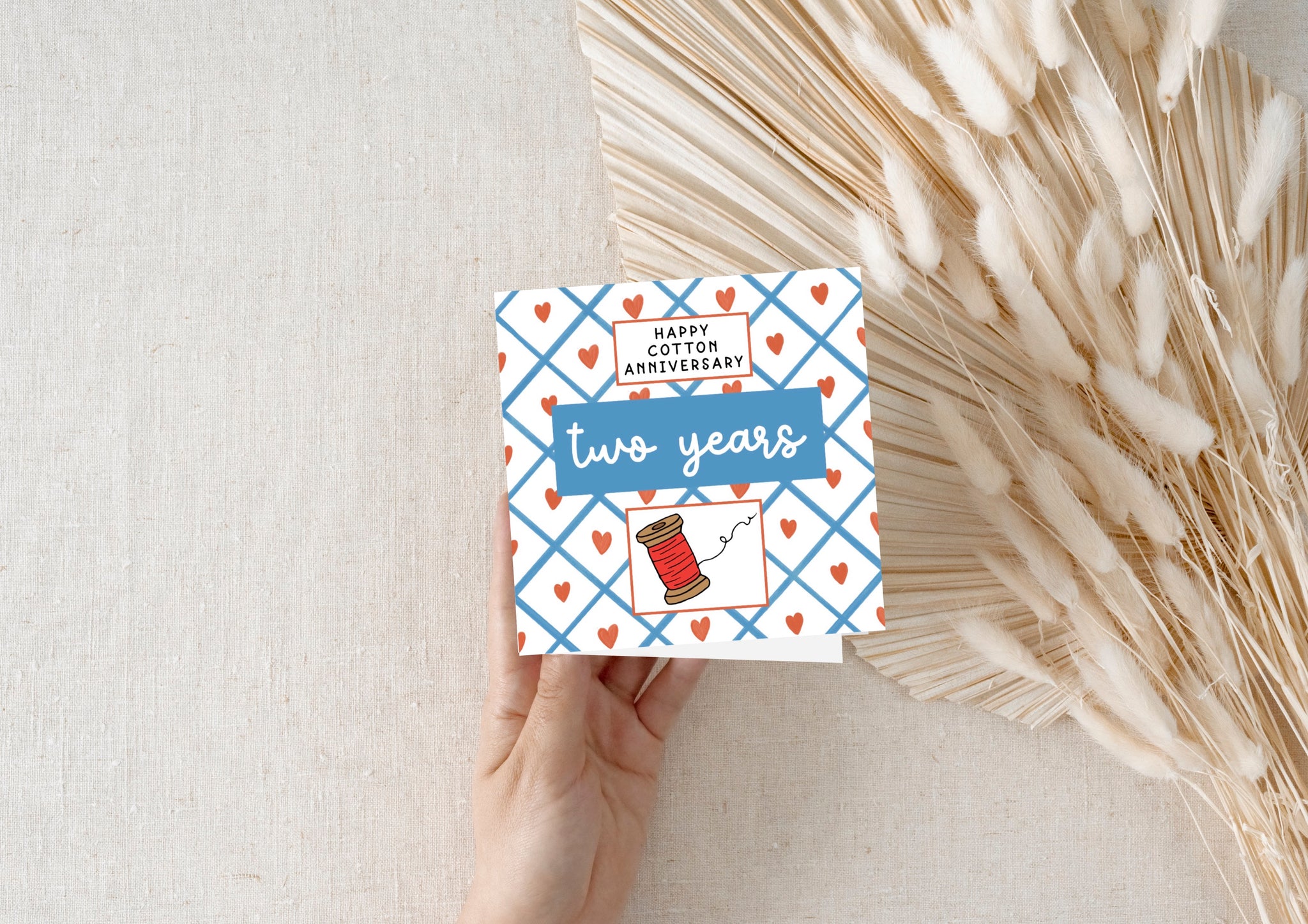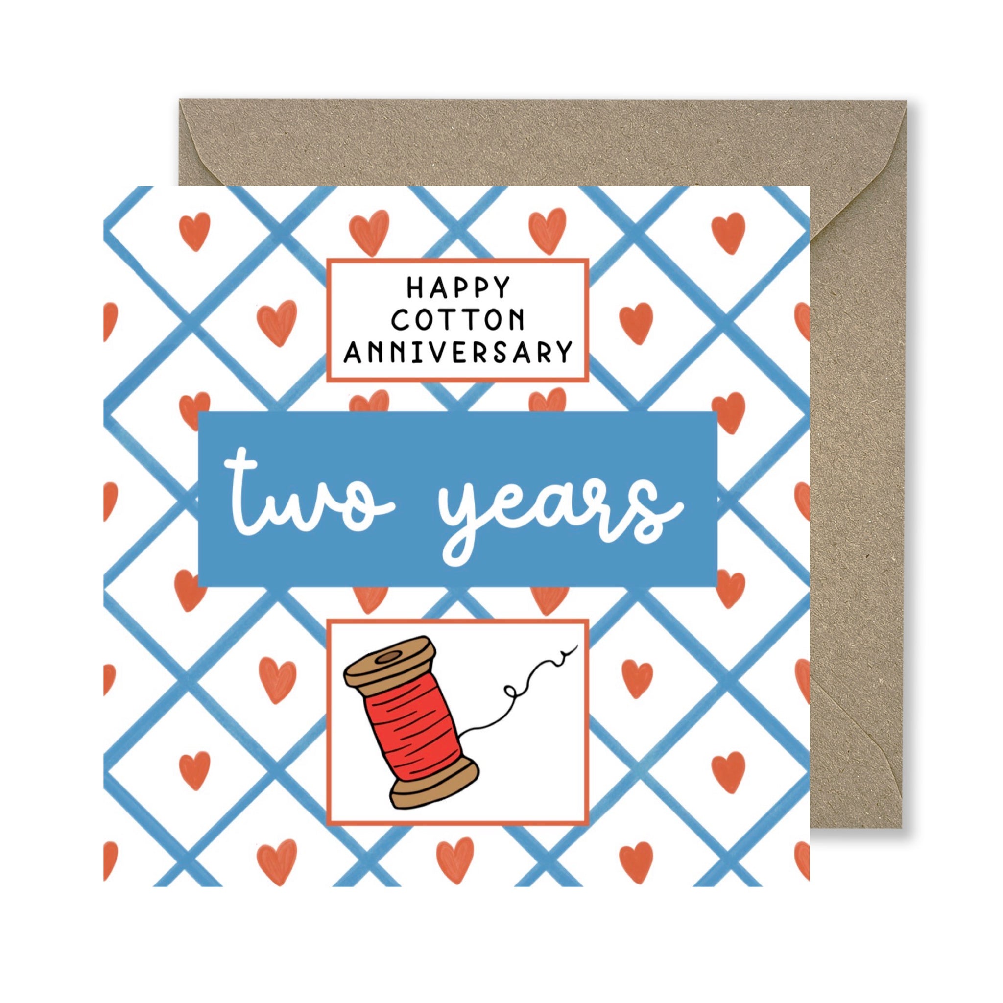 This square 15cm x 15cm card features a hand-drawn watercolour design with retro typography that reads "HAPPY COTTON ANNIVERSARY" topped off with a handrawn red cotton reel for a touch of warmth.