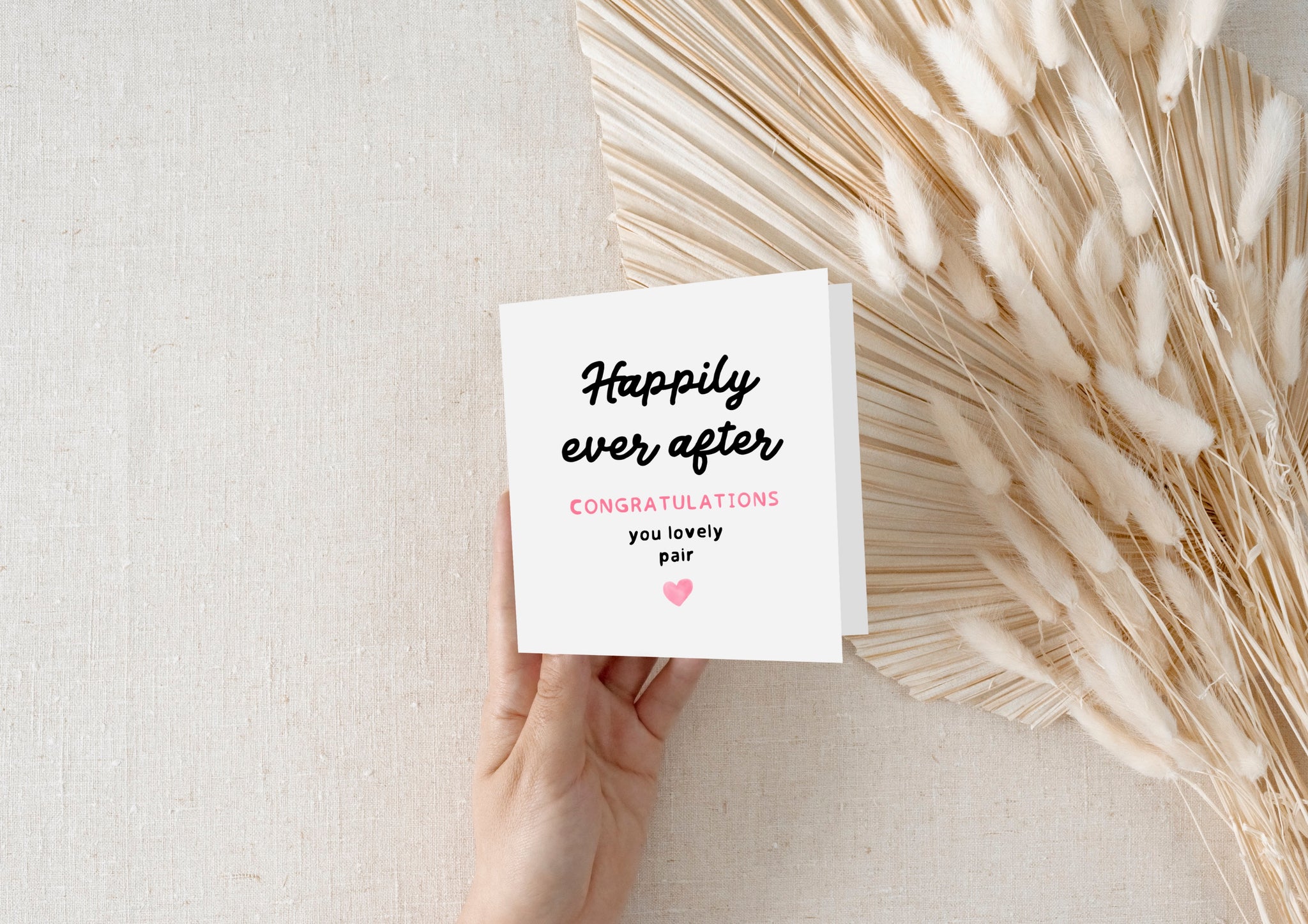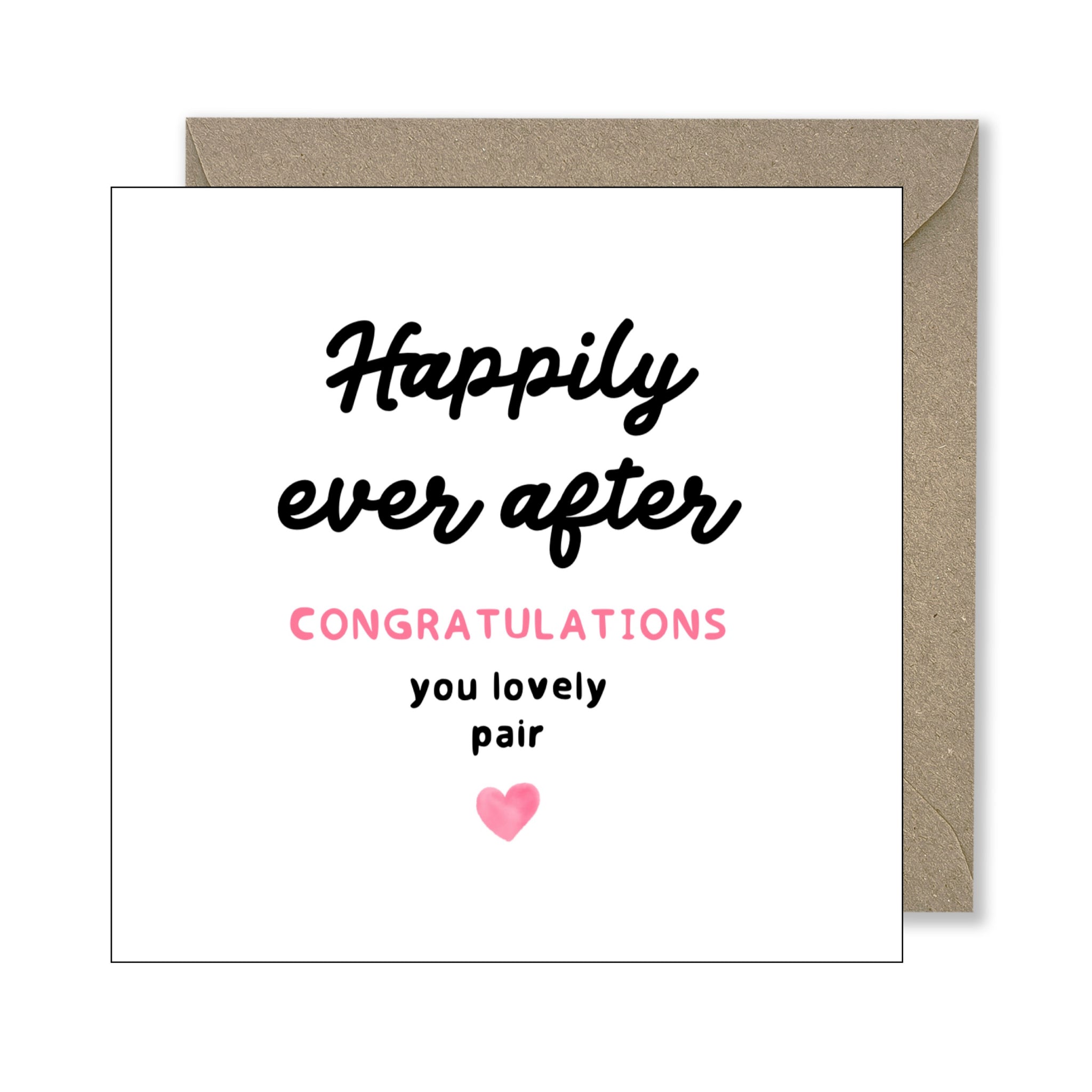 This square 15cm x 15cm card features a clean, minimalist design with handwritten-style typography that reads "Happily Ever After - Congratulations you lovely pair" finished off with a small pink heart for a touch of warmth.