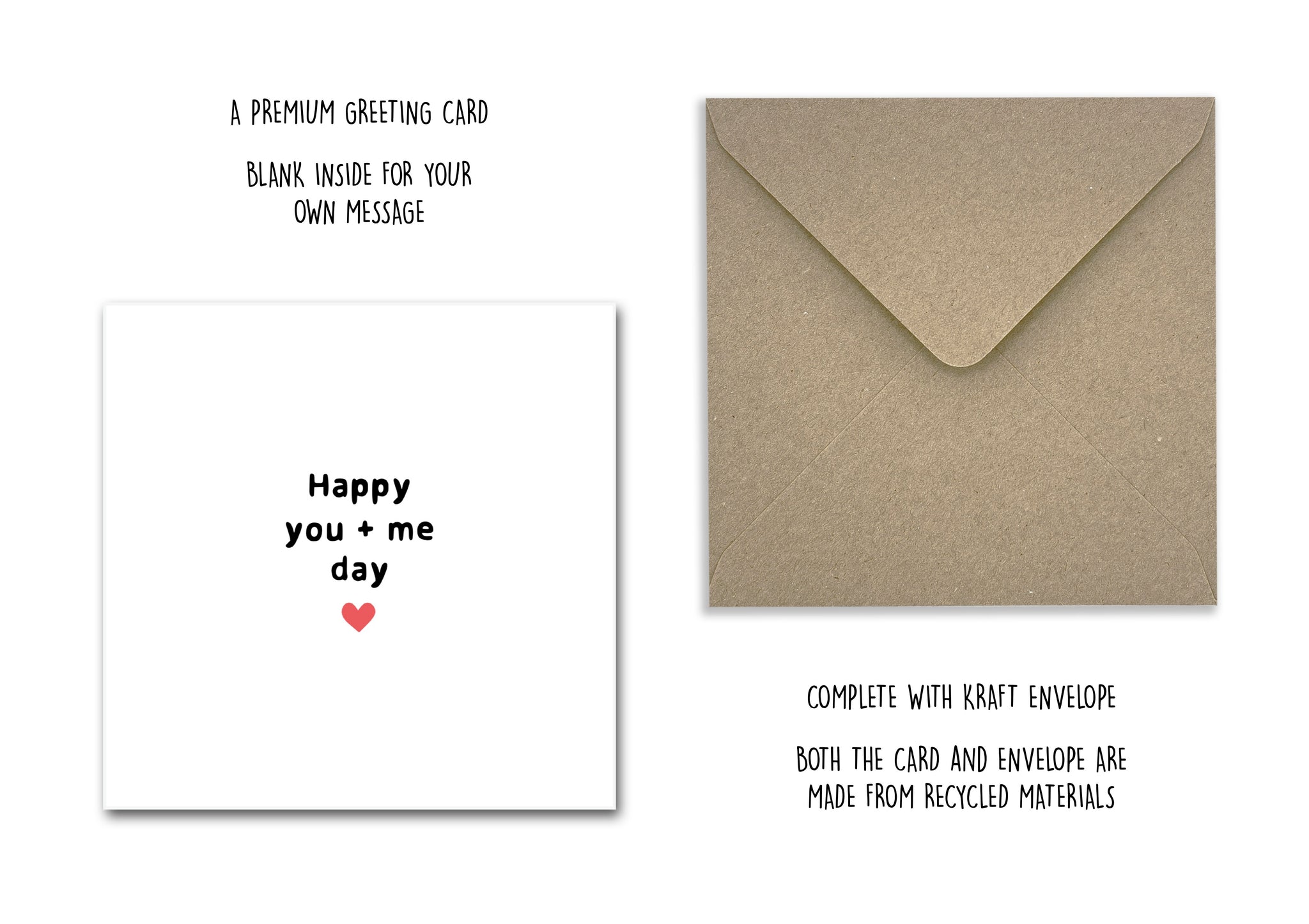 This square 15cm x 15cm card features a clean, minimalist design with handwritten-style typography that reads "Happy You + Me Day" topped off with a small red heart for a touch of warmth.